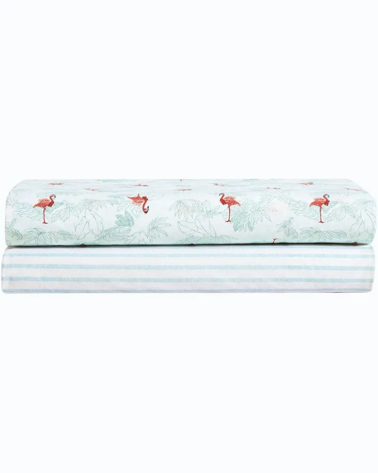 A festive flamingo print brings the good cheer to your bedding ensemble in this holiday-ready sheet set, crafted from breathable cotton.