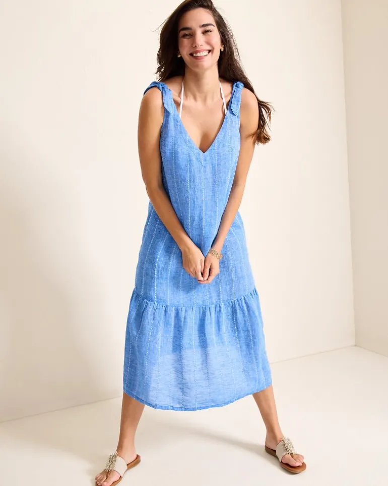 Lightweight linen in a dreamy blue hue inspires an effortlessly elegant coverup dress, finished with a single-tiered hem and dainty tie details at the straps.