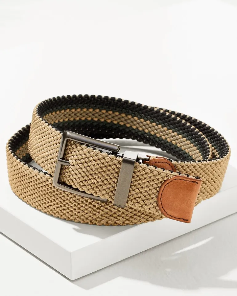 Work or play when you accessorize your office look with this leather, reversible belt with effortlessly comfortable stretch. Whether you opt for the solid hue or the stripe design on its reverse side, it makes your casual denim or khakis feel a little more polished.