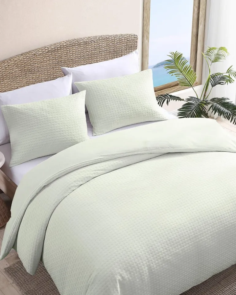 Transform your bedroom into a serene oasis with this unique woven bedding set, featuring a calming green hue and a smooth cotton percale texture on its reverse side.