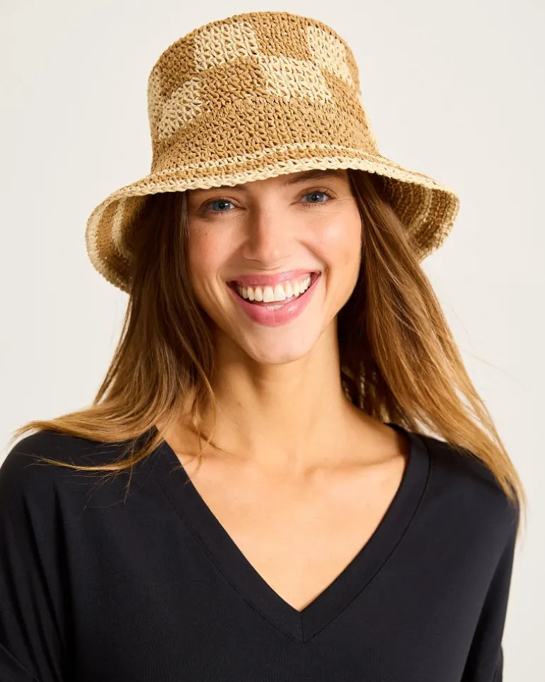 Add flair to your getaway style with this trendy, checkered bucket hat that’s thoughtfully designed for easy packability.