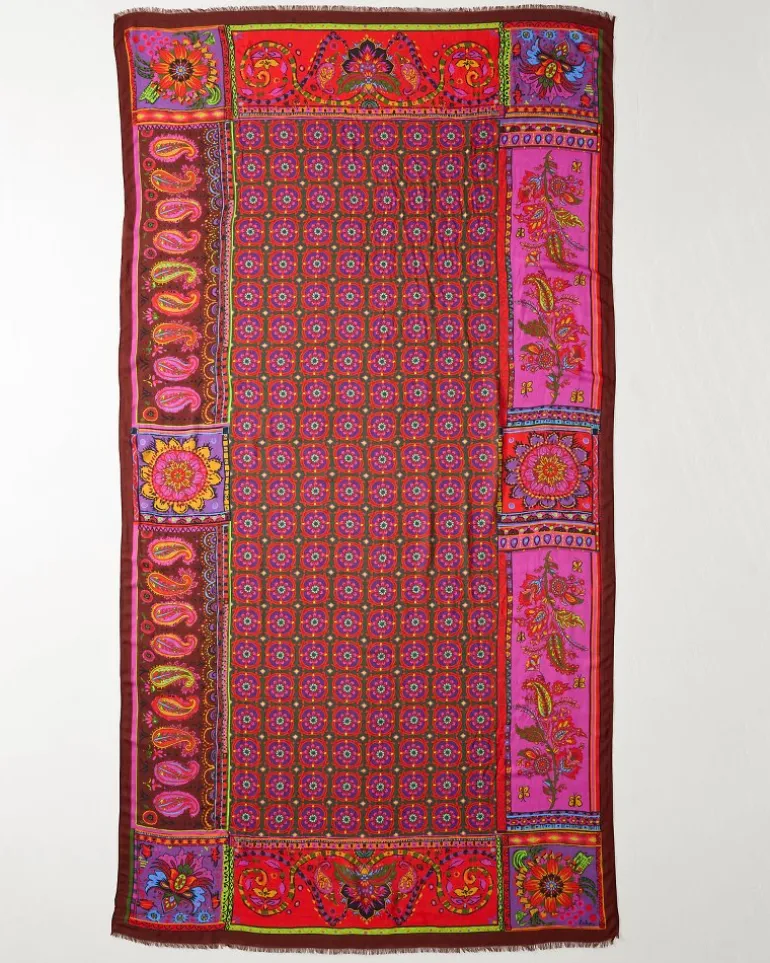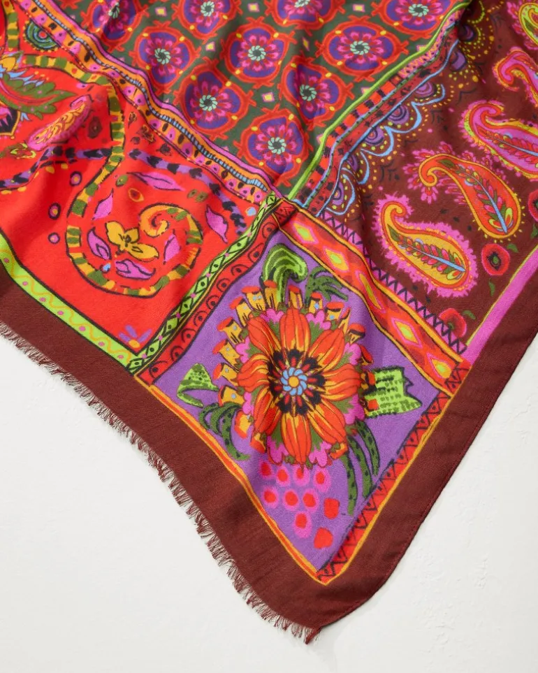 A colorful and ornamental patchwork design inspires a bold scarf style you can accessorize so many ways, whether you wrap it around your neck or use it as a hair or handbag decoration.