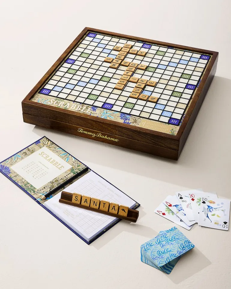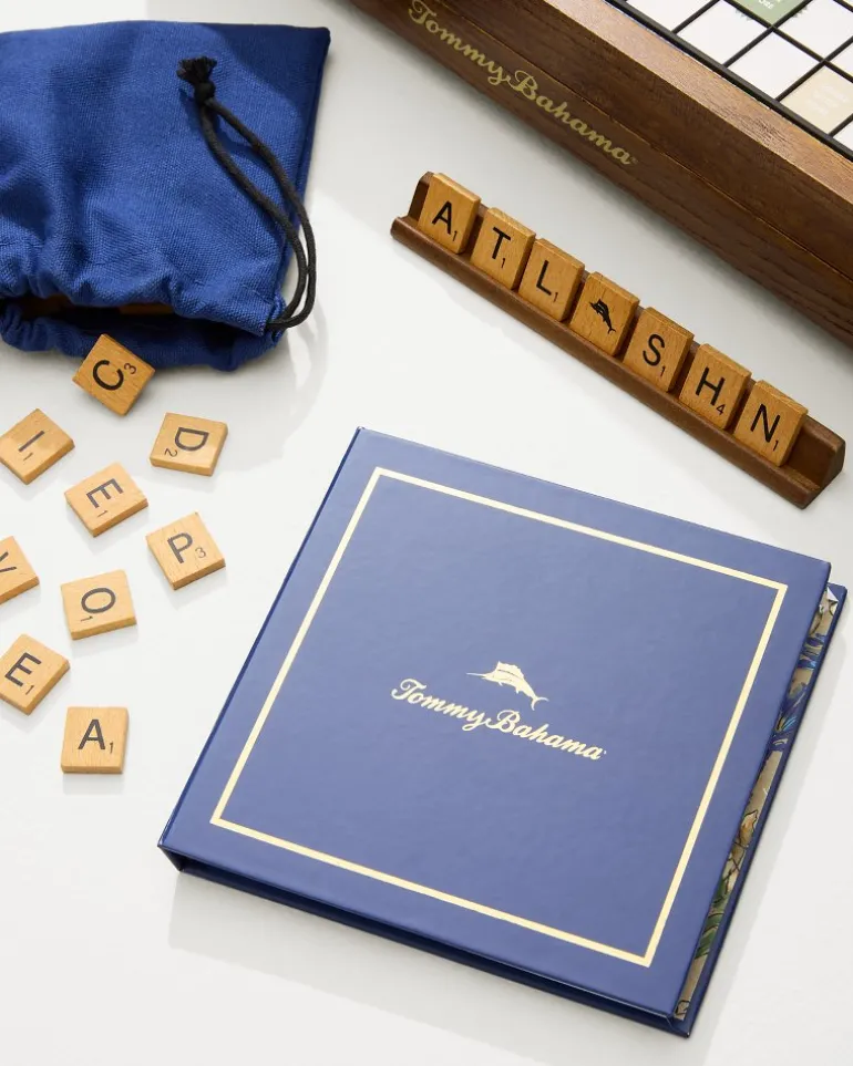 Bring the spirit of paradise to game night with this ultra-elevated deluxe Scrabble game set. Its thoughtfully elegant design features an innovative, rotating wooden board, adorned with island-inspired motifs and our signature Tommy Bahama branding. Wordsmiths, how many points for V-A-C-A-T-I-O-N?
