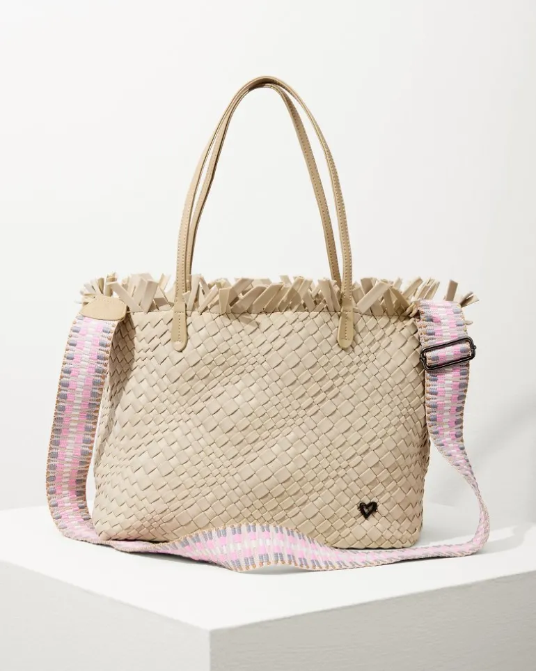 Meet your new favorite everyday tote. This handwoven design features a spacious interior for carrying all the essentials, while offering versatile wearability with a removable crossbody strap. Plus, it comes with a matching wristlet to help you separate your belongings!