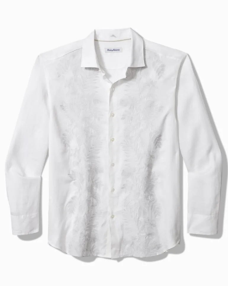 Your favorite classic white button-down just got an upgrade! Made from 100% linen, this long-sleeve style is breezy and breathable and features floral stitched embroidery that offers some subtle stylish flair. There’s simply no silhouette more perfect for a seaside ceremony—this wedding-ready white is all you need.