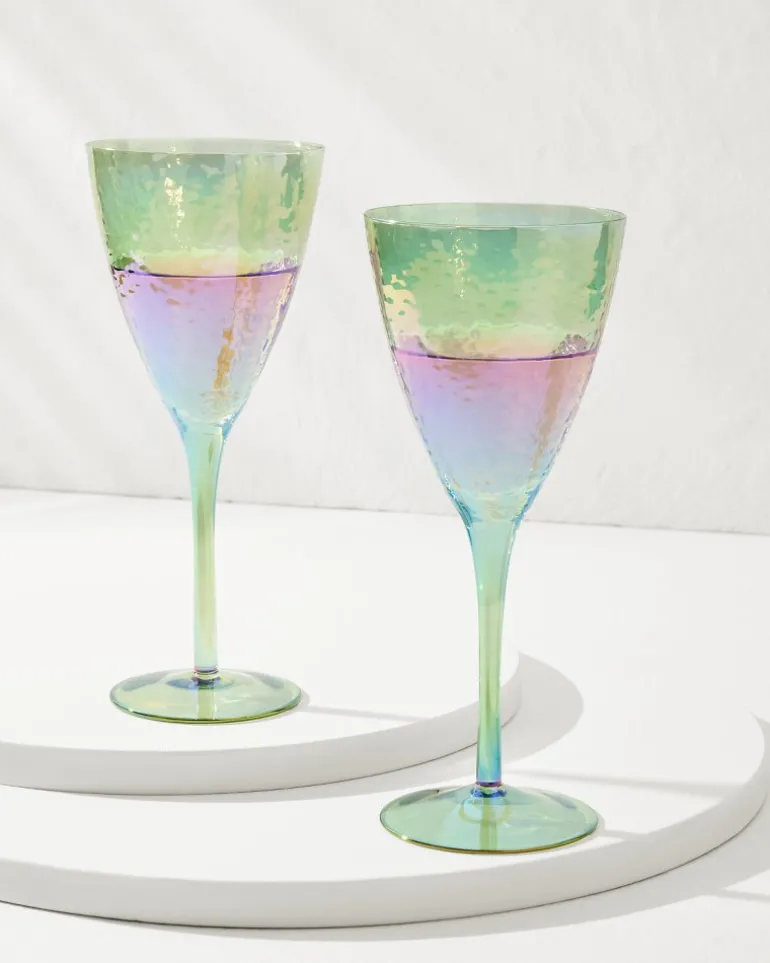 A unique hammered texture with a mesmerizing, colorful finish elevates this pair of modern wine glasses, a perfect gift for the at-home entertainer with an elegant aesthetic.