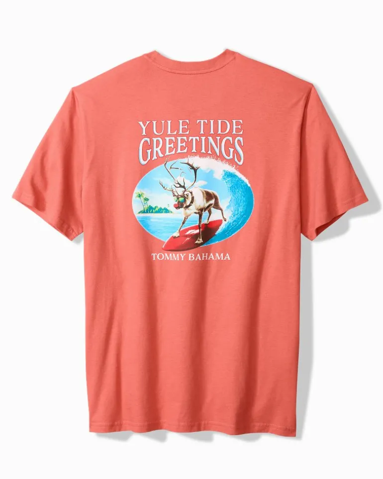 Rudolph’s sleigh looks a little different in paradise… Featuring a playful screenprint graphic of everyone’s favorite reindeer surfing the yule tide, this soft, 100% cotton T-shirt is an easygoing style that’s perfect for lounging in during the holiday season.